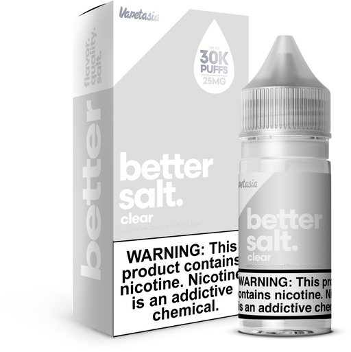 Treat yourself to Clear BETTER SALT by Vapetasia, a simple yet effective flavorless nicotine salt e-liquid. Perfect for keeping cravings in check, ...